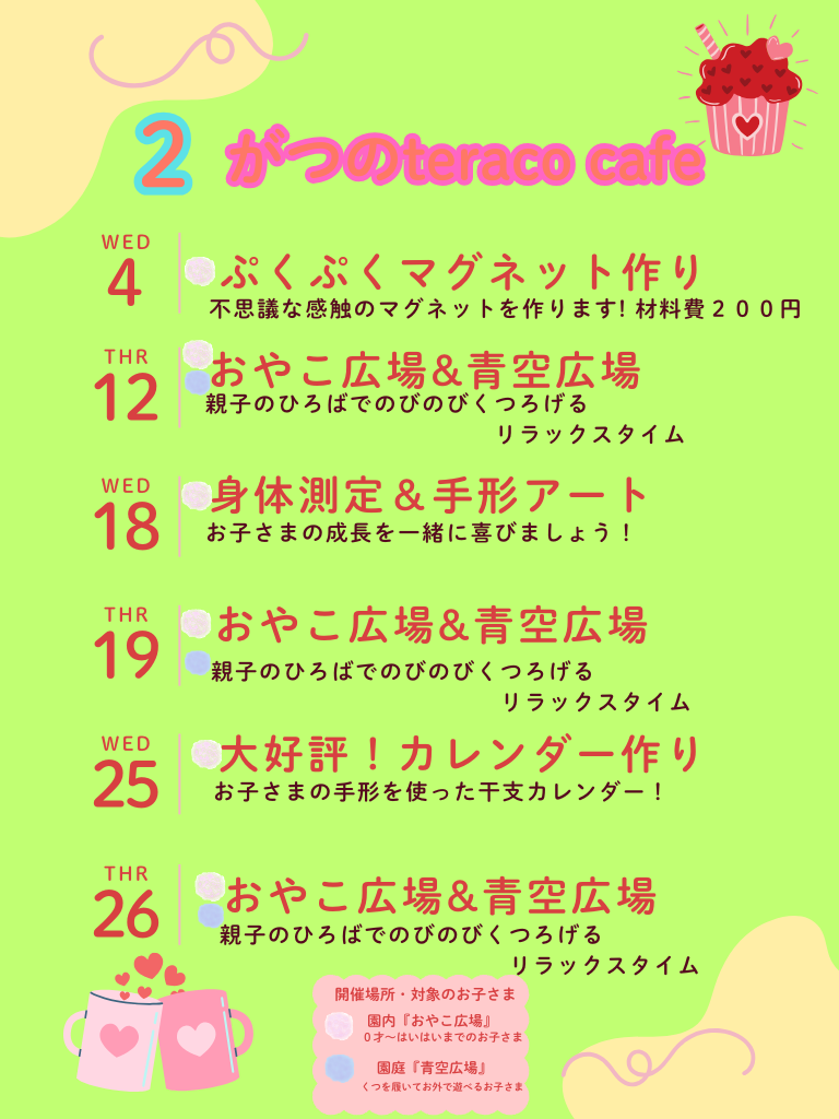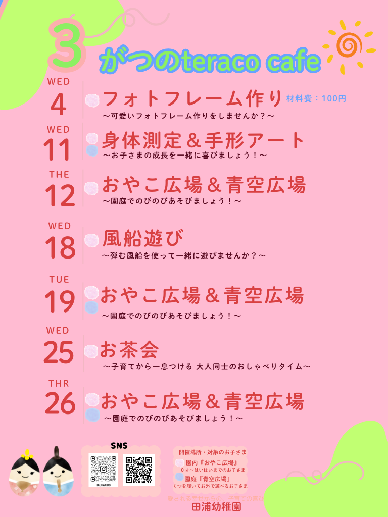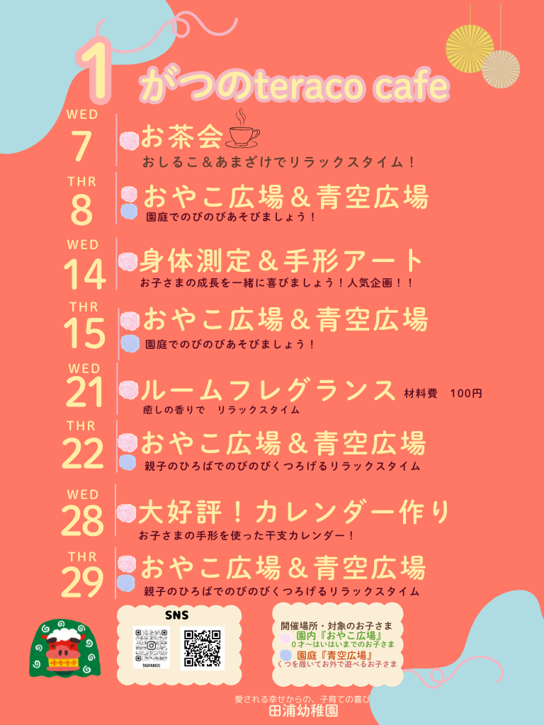 周りに気軽に子育てのことを話せるお友だちがいない、というお悩みを抱えてはいませんか?teraco cafeの対象は0歳児・1歳児のお子さまを子育て中のママやパパです。また、マタニティママ向けのイベントも定期的に開催しております。